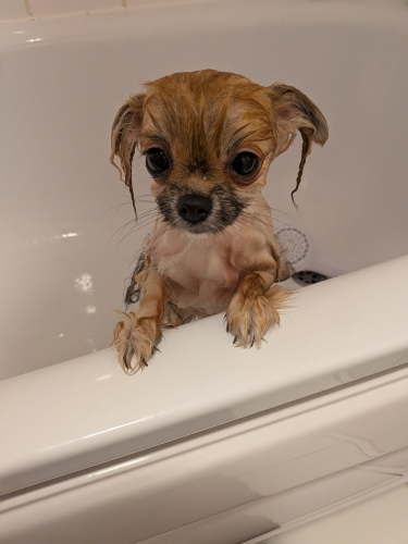 Poppy is a ten-year-old terrier mix. She loves to bark when new dogs come but quickly calms and mostly ignores boarding dogs.